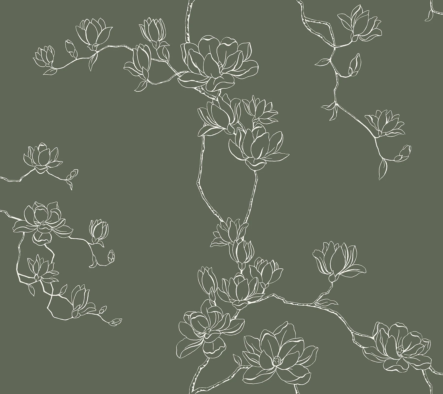 Finom ágak, melyeket dús magnólia virágok borítanak, fehér kontúrral emelkednek ki az örökzöld háttér előtt, hogy kiemeljék a virág könnyed, egyszerű szépségét.