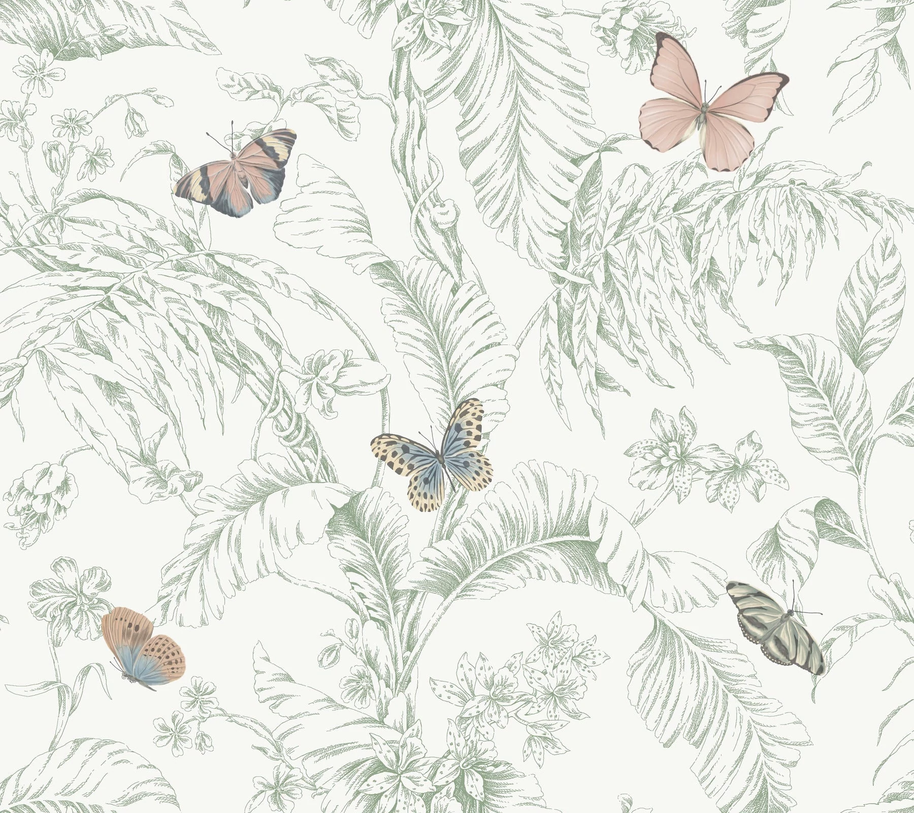 A Papillon mintában élénken festett narancssárga és kék pillangók tűnnek elő a trópusi növényzet finom fekete vonalrajzai között.
