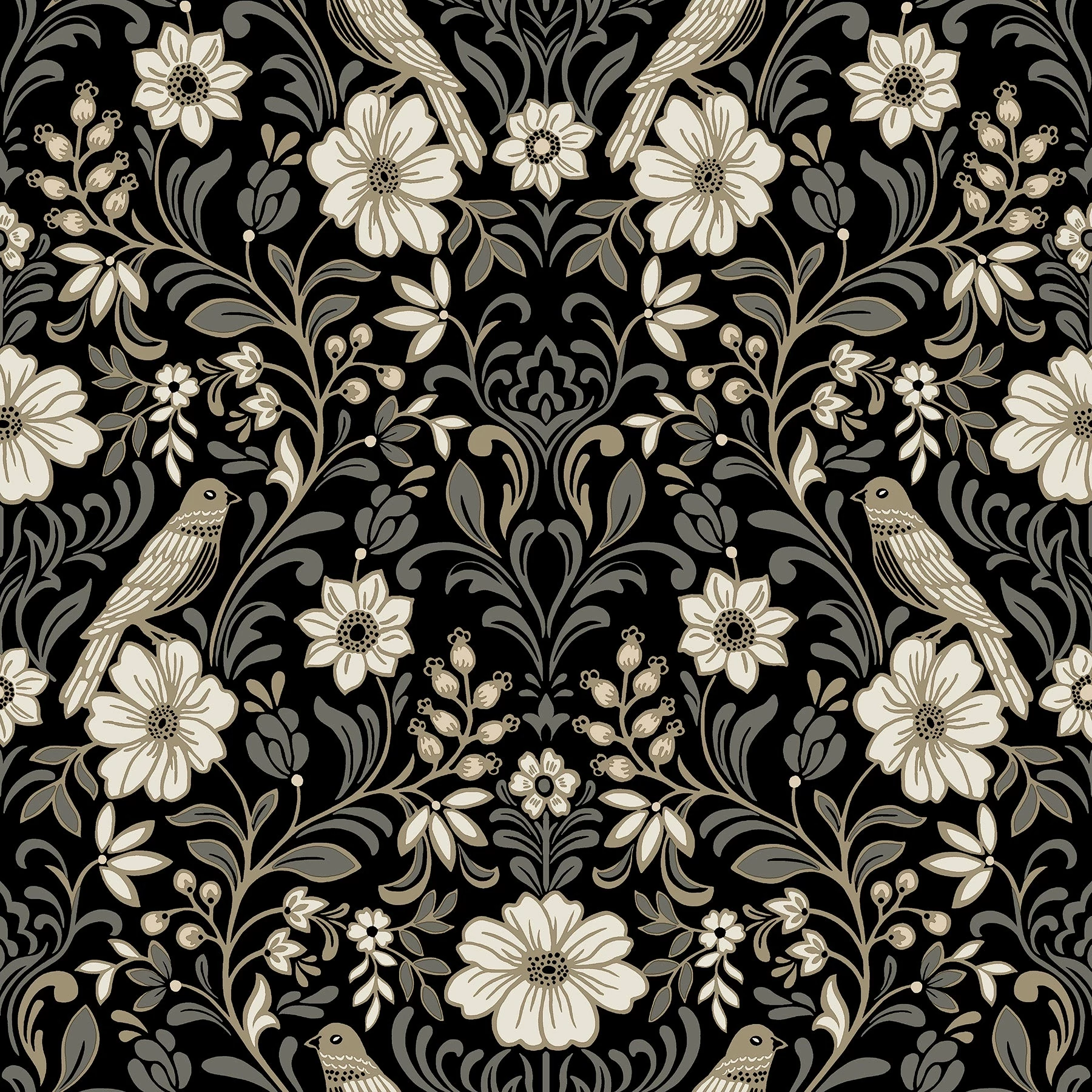 A verébcsapatok gazdag szőlőindák és érett bogyók között, virágzó virágokon ülnek ebben a bájos erdei damaszt tapétában. Fehér és semleges részletekkel díszítve, fekete háttér előtt.