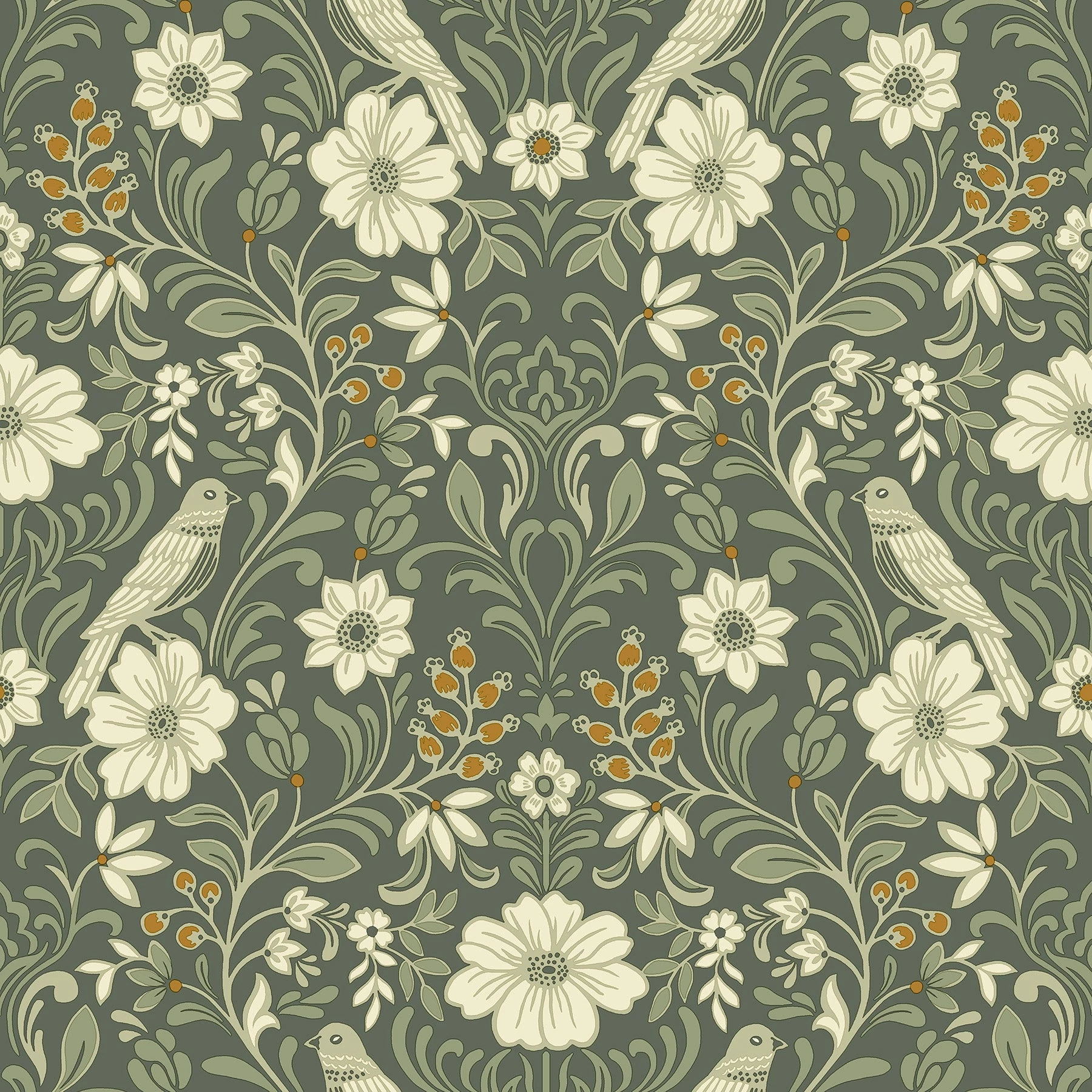 A verebek virágzó bimbókon ülnek gazdag indák és érett bogyók között ebben a bájos erdei damaszt tapétában. Krém, zsálya és terrakotta részletekkel, örökzöld háttér előtt.