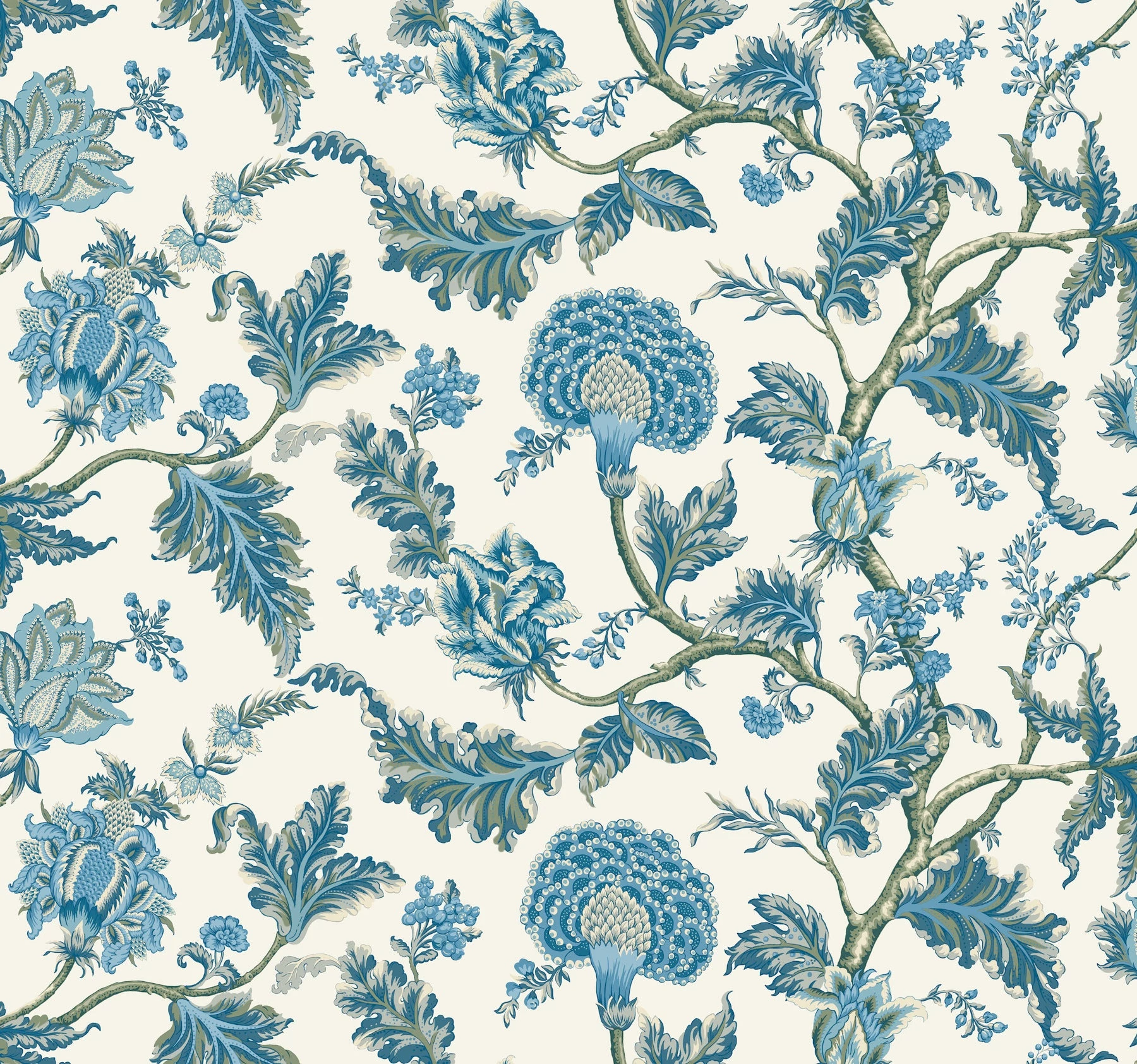 Gazdag levelek és buja, többrétegű virágok díszítik a kanyargó ágakat Monroe lenyűgöző méretű Jacobean mintájában.
